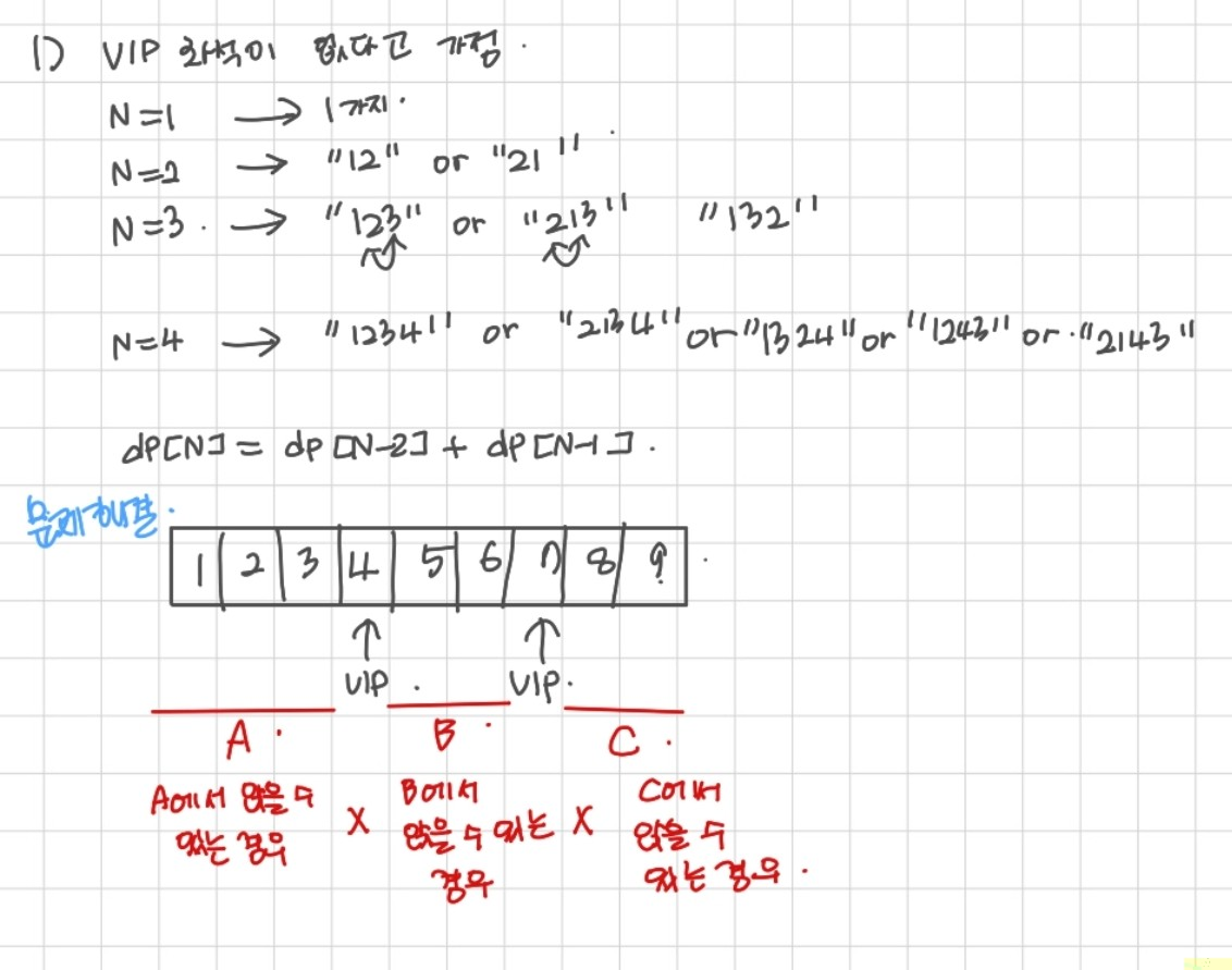 - VIP 회원들의 좌석 번호들이 주어졌을 때, 사람들이 좌석에 앉는 서로 다른 방법의 가짓수를 구하는 프로그램을 작성하시오.