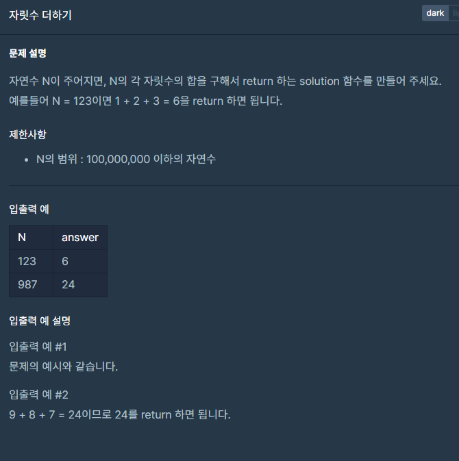 - 각각의 자릿수를 더해야 하므로 n을 String으로 변환한다